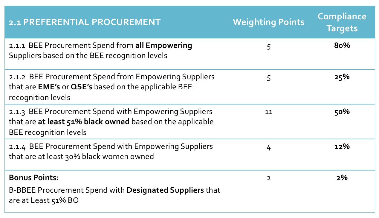 Another interesting introduction is the enhanced benefit of spend with 51% Black Owned and 51% Black Female Owned suppliers using the flow through principle only. Any spend with these suppliers will be enhanced by a factor of 2. Effectively this means that if you spend R1 with a Level 2 51% Black Owned supplier, you can now claim R2,50 on your scorecard. This is hugely beneficial and would certainly help in achieving the 50% compliance target for 11 points.